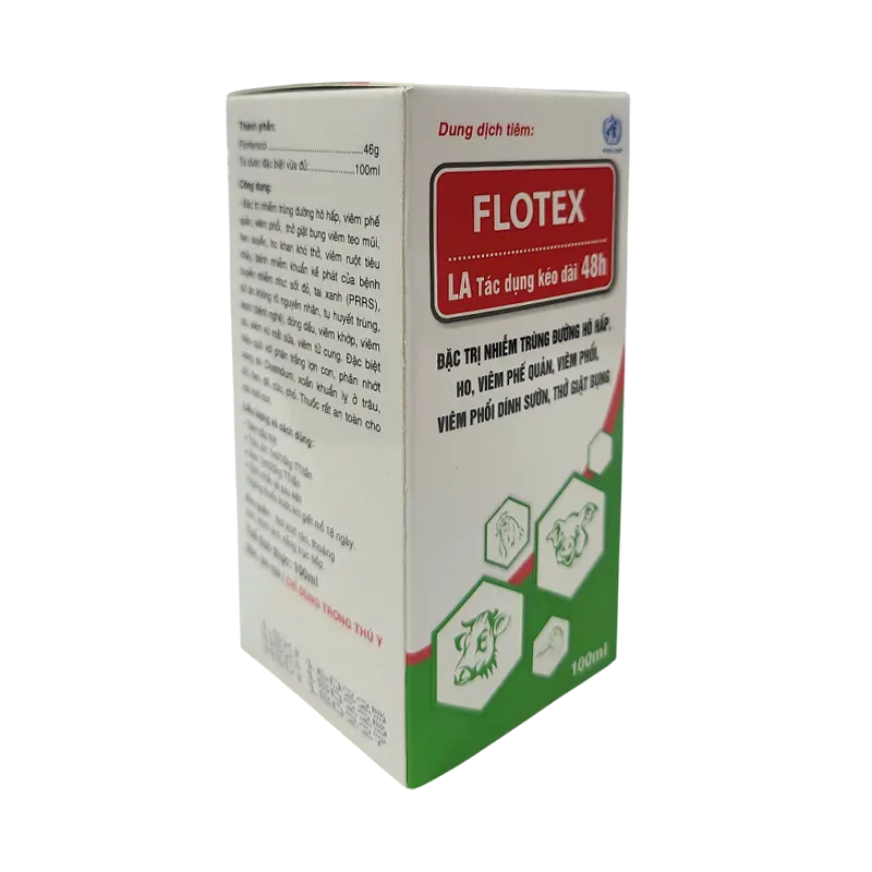 FLOTEX là kháng sinh thế hệ mới dạng tiêm, chuyên dùng trong thú y, có phổ tác dụng rộng và mạnh, đặc trị các bệnh nhiễm trùng đường hô hấp, tiêu hóa, viêm khớp, viêm da và các bệnh kế phát do virus truyền nhiễm. Sản phẩm được đánh